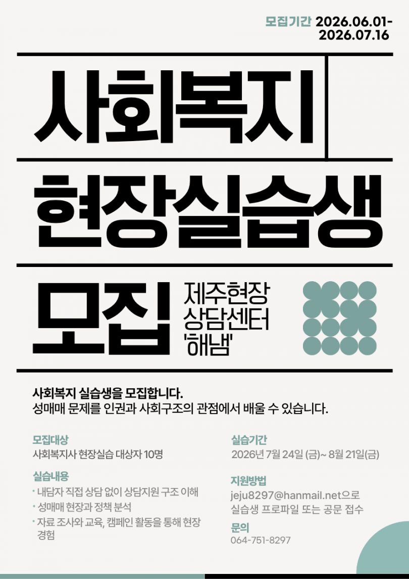 2026년 제주현장상담센터'해냄' 사회복지현장실습생 모집 공고