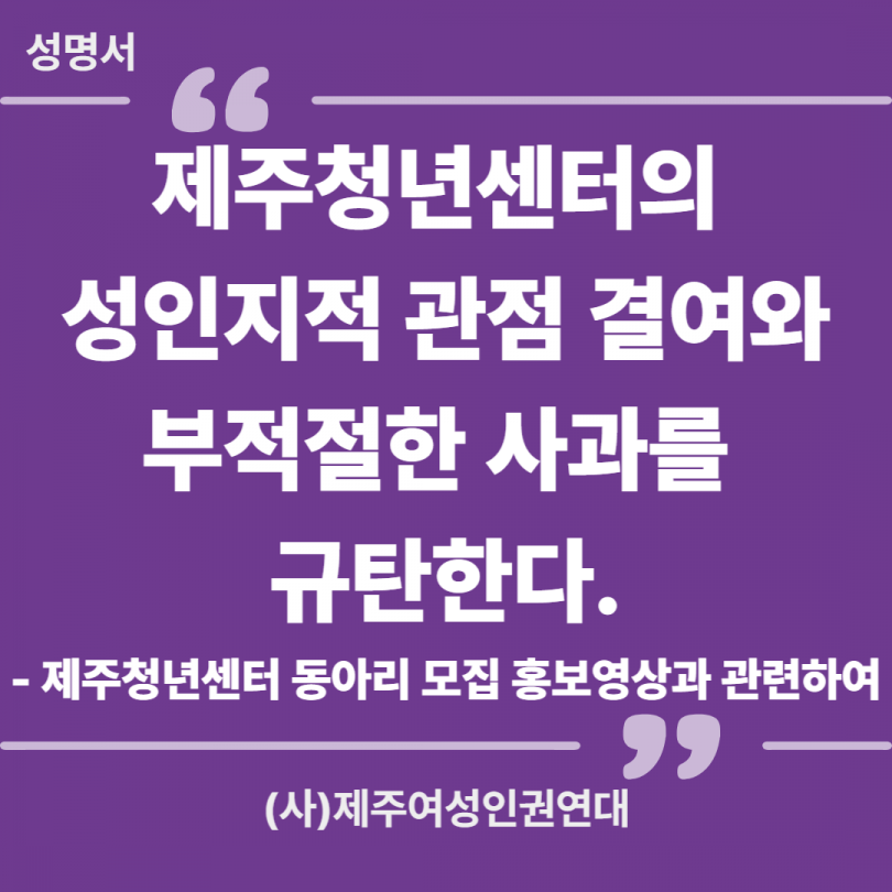 [성명서] 제주청년센터의 성인지적 관점 결여와 부적절한 사과를 규탄한다. – 제주청년센터 동아리 모집 홍보영상과 관련하여 –
